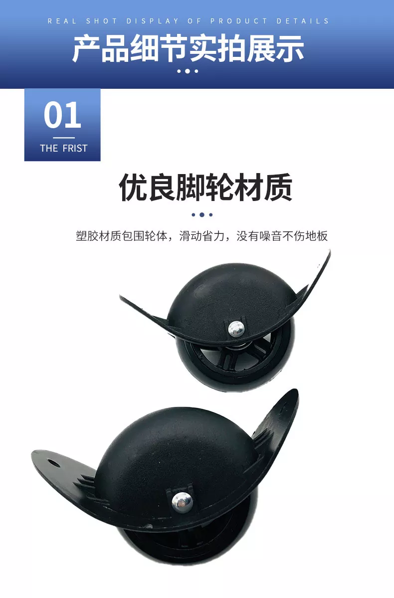 Tá an Roth Cás Tralaí déanta as ábhar nua PU ardchaighdeáin, atá uiscedhíonach, taise-cruthúnas, lasair-retardant, agus teas-resistant. Tá an t-ábhar lightweight agus sár-chaitheamh-resistant. Imthacaí, dé-imthacaí tógtha, déanta as cruach carbóin ardchaighdeáin, le rothaí réidh agus gan bhac, rud a fhágann go bhfuil siad níos durable; Roth Cás Tralaí Mórdhíola, Lúibín, lúibín tiubhaithe, leictreafóiréis dromchla tiubhaithe, níos mó resistant brú agus níos láidre; Coscánú Roth Cás Tralaí, dearadh coscán dé, agus na rothaí á gcoscánú, ag coscánú an treo le haghaidh sábháilteachta níos fearr.